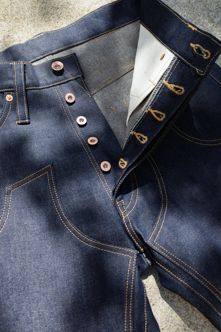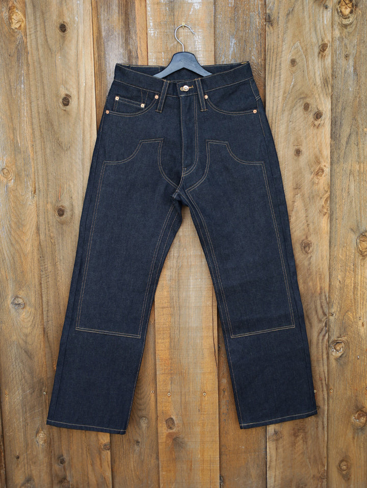 Straight cut 14oz double knee denim in custom milled brown weft, size 30x30.