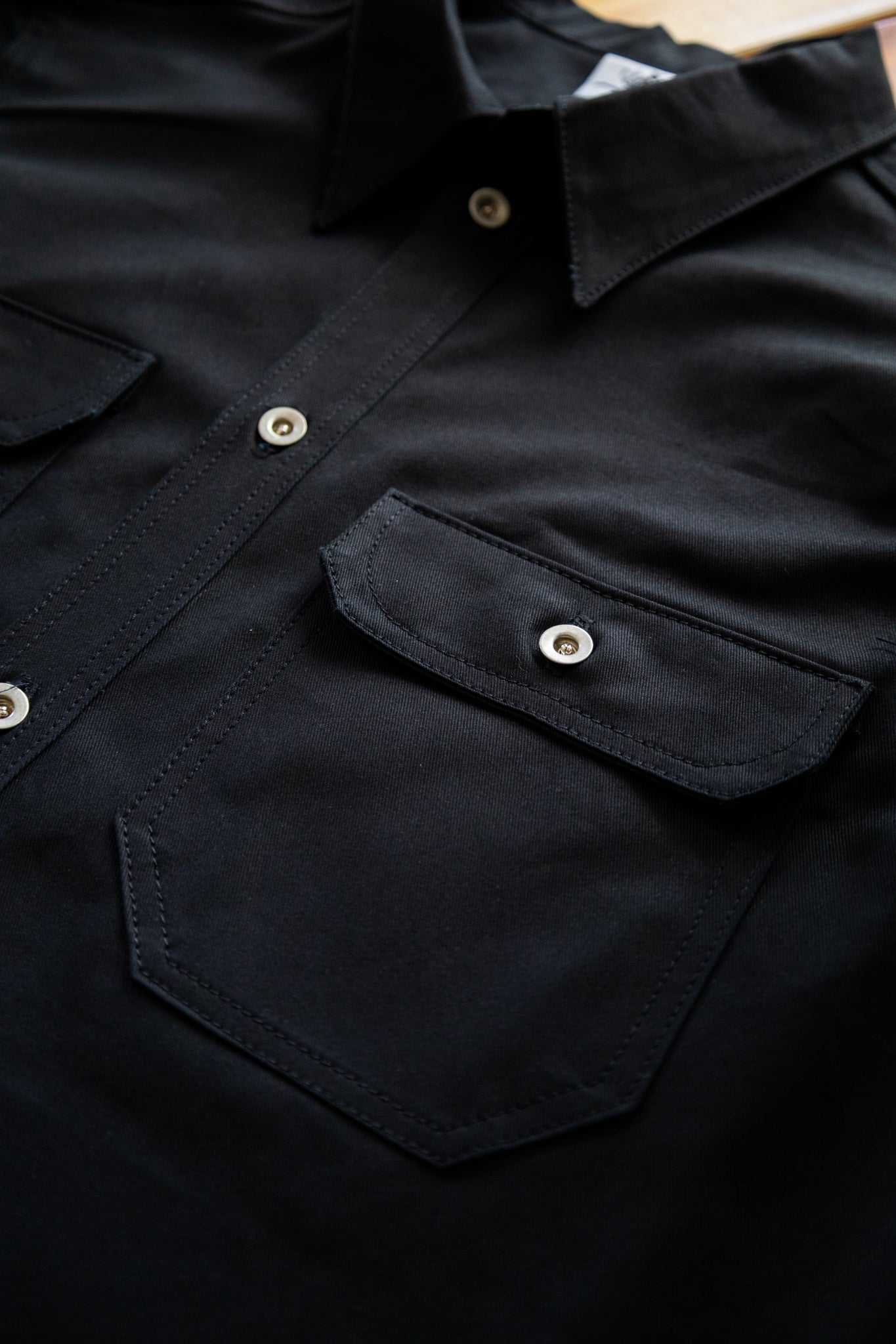 The Surplus shirt is handcrafted from an 8oz black left hand twill and features antiqued hardware, unstructured collar and single needle construction. Each shirt is made to order, cut in-house and sewn on restored vintage Reece, Singer and Union Special machines in California, USA.