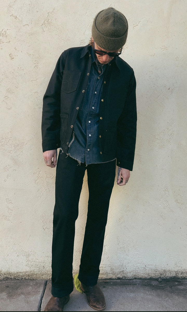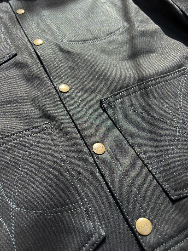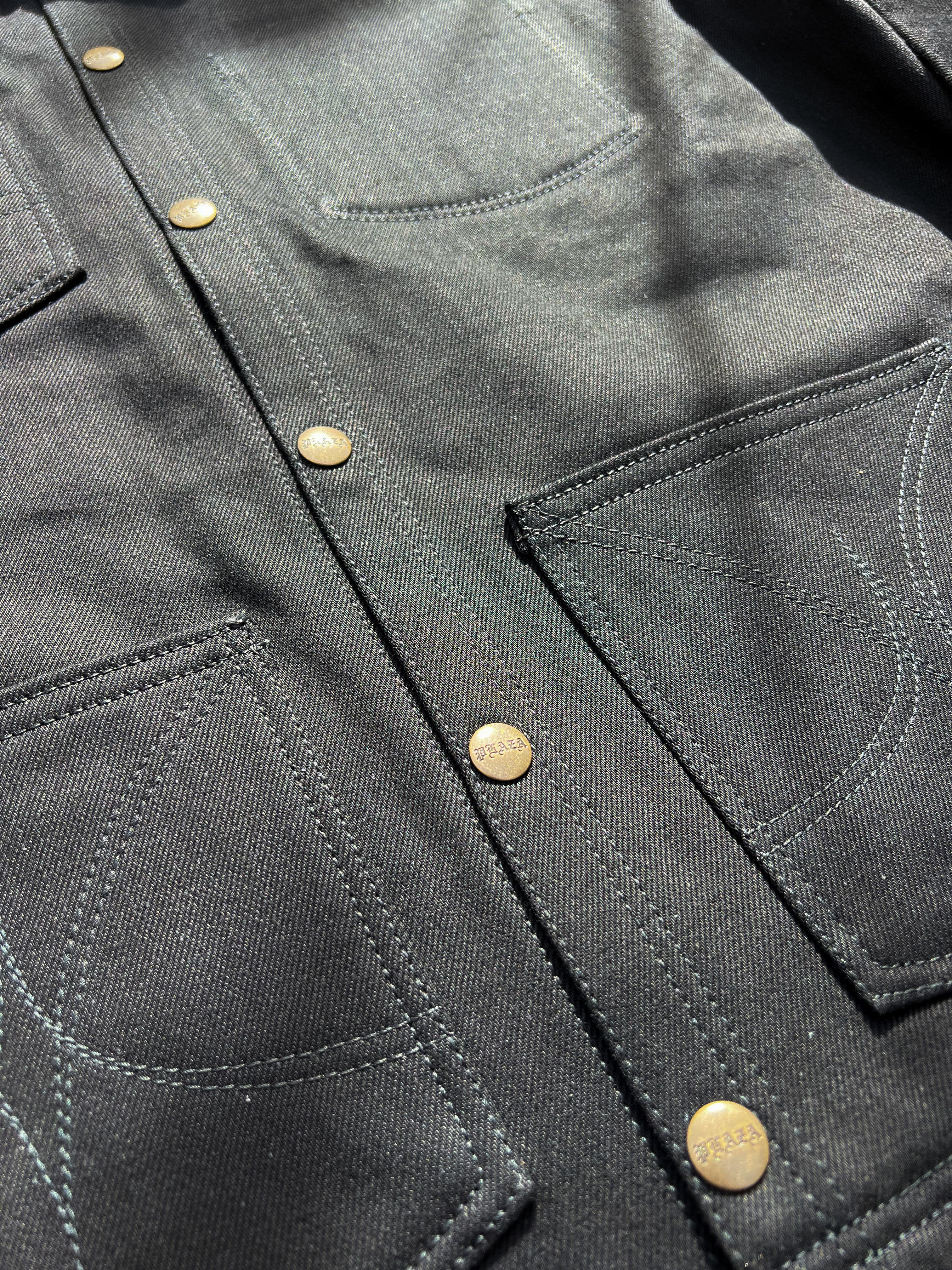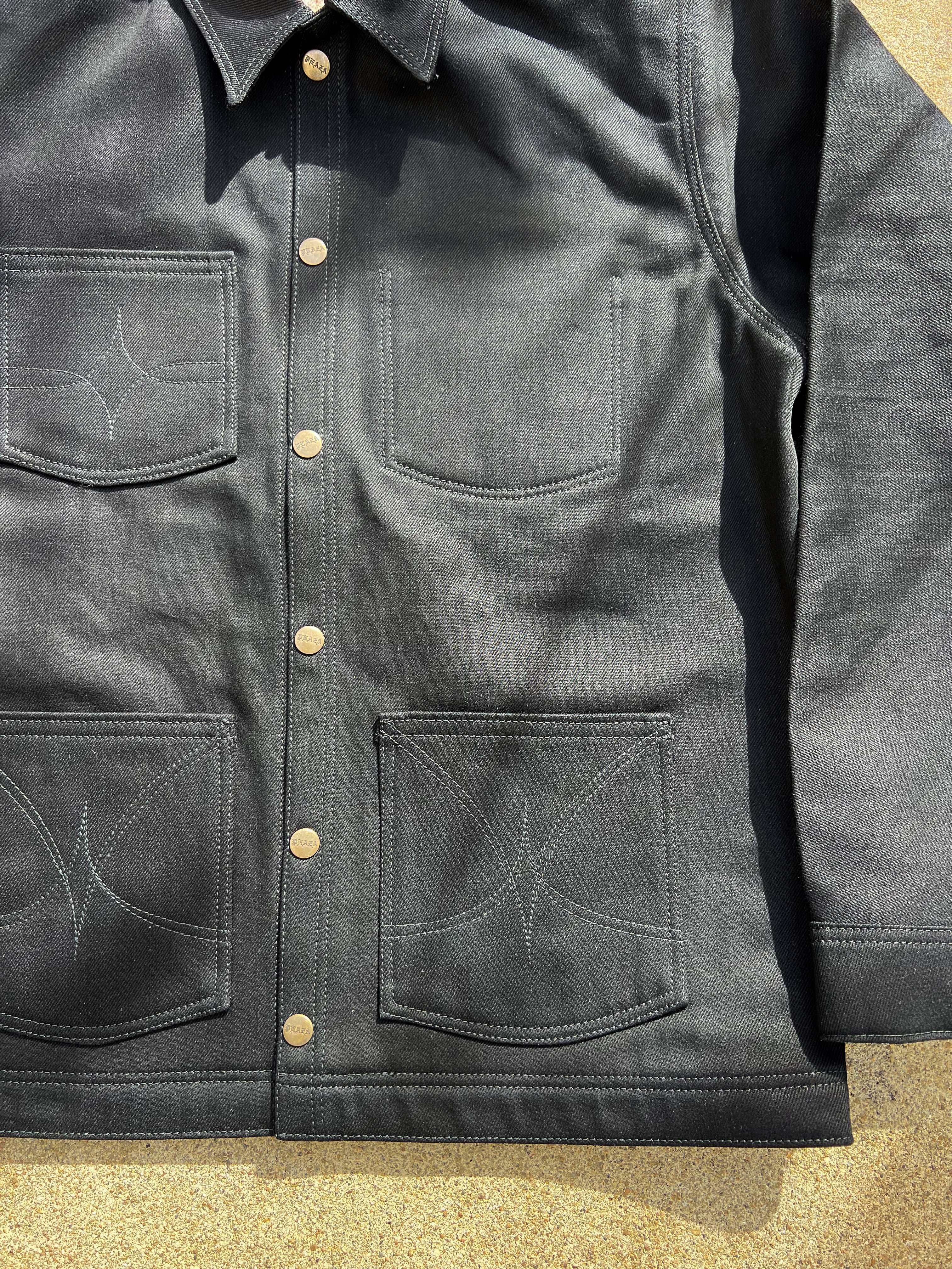 The Watson Chore Jacket is designed with both style and durability in mind. Constructed from rugged 14oz double black Japanese Bull Denim, it features a beautiful 9oz Japanese flannel lining. Hand stitched single needle sewn arcuates on the front and inner pockets. Each Jacket is finished with antiqued embossed hardware on its front closure and cuffs, The Watson jacket showcases vintage-inspired elements blended with modern durability.
