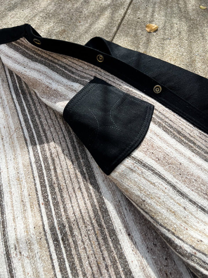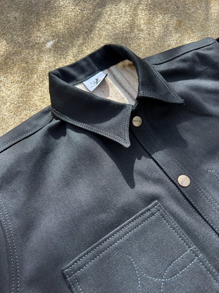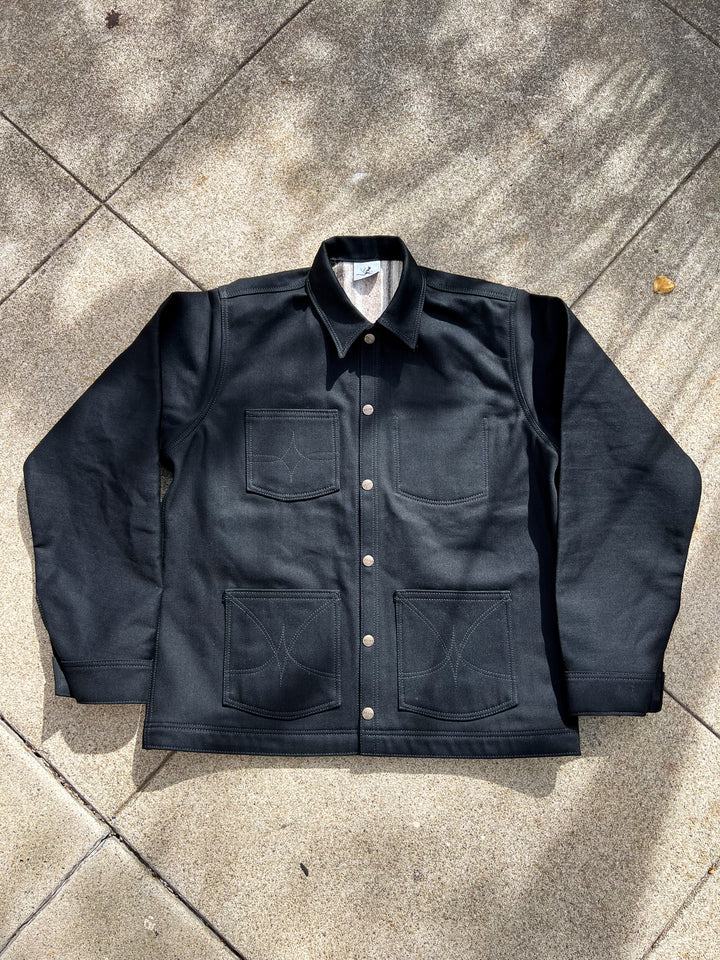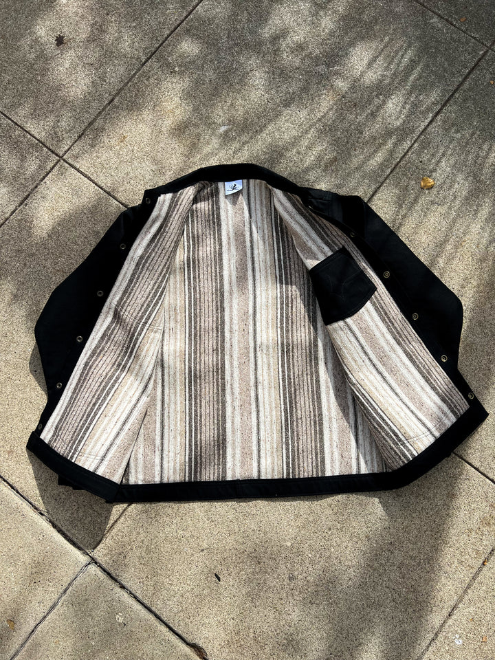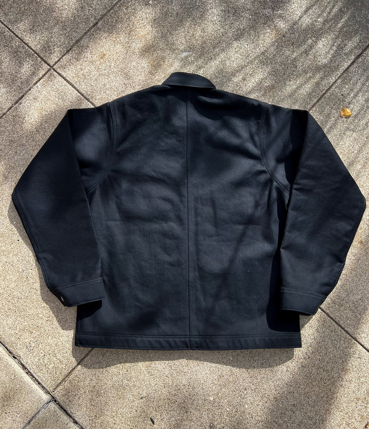 The Watson Chore Jacket is designed with both style and durability in mind. Constructed from rugged 14oz double black Japanese Bull Denim, it features a beautiful 9oz Japanese flannel lining. Hand stitched single needle sewn arcuates on the front and inner pockets. Each Jacket is finished with antiqued embossed hardware on its front closure and cuffs, The Watson jacket showcases vintage-inspired elements blended with modern durability.